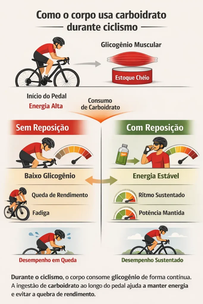 Durante o ciclismo, o corpo usa carboidrato como principal combustível para sustentar esforço contínuo e intensidade moderada a alta.