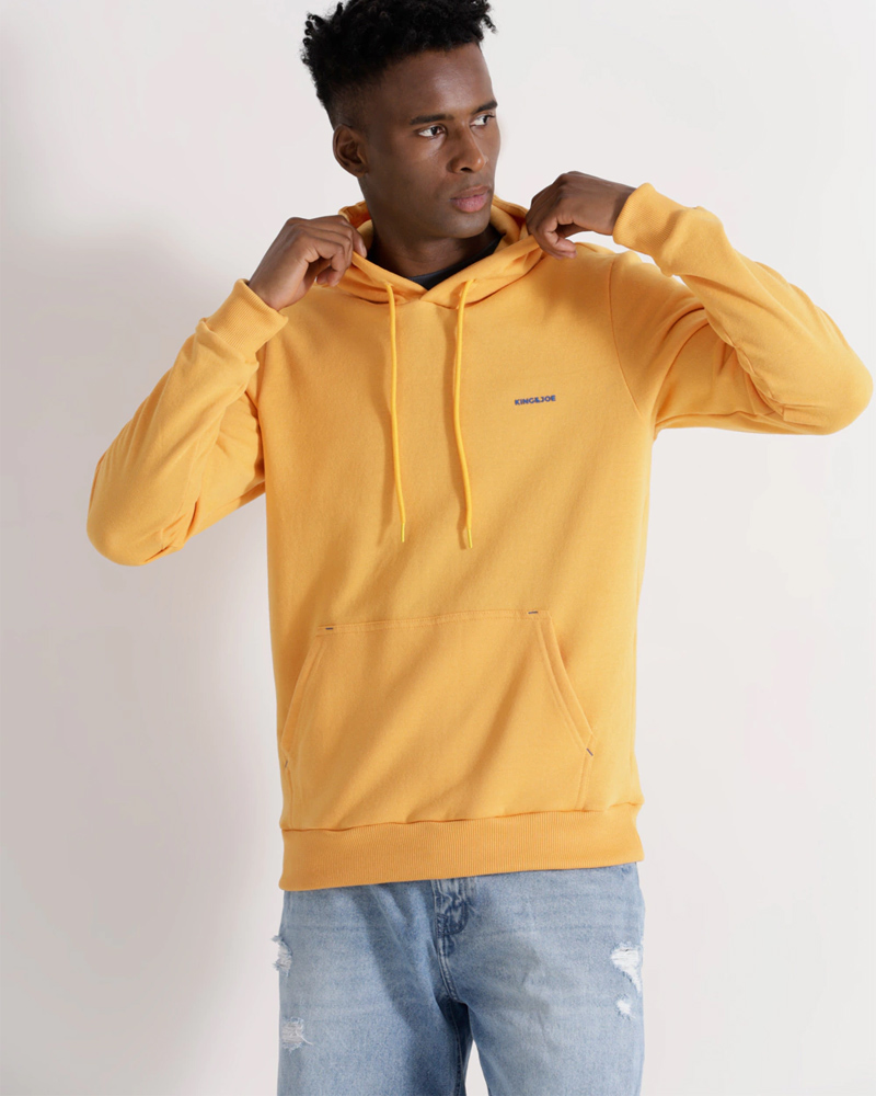 A cor amarela adiciona um toque de energia ao visual, fugindo do tradicional e trazendo destaque para os looks de inverno. Possui modelagem ajustada, mangas e barra com acabamento em ribana e gola careca canelada. O capuz tem cordão de regulagem com ponteira, além de ter bolso canguru.
