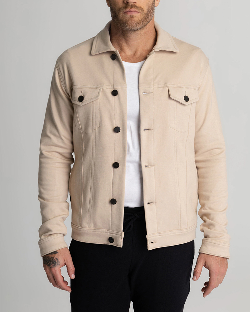 A jaqueta combina o visual despojado do jeans com a leveza da malha – uma aliada prática para os dias frios. Versátil, funciona bem no dia a dia, quando o clima pode mudar de repente. O tom bege é fácil de combinar, e o tecido com algodão e elastano oferece conforto e liberdade de movimento.