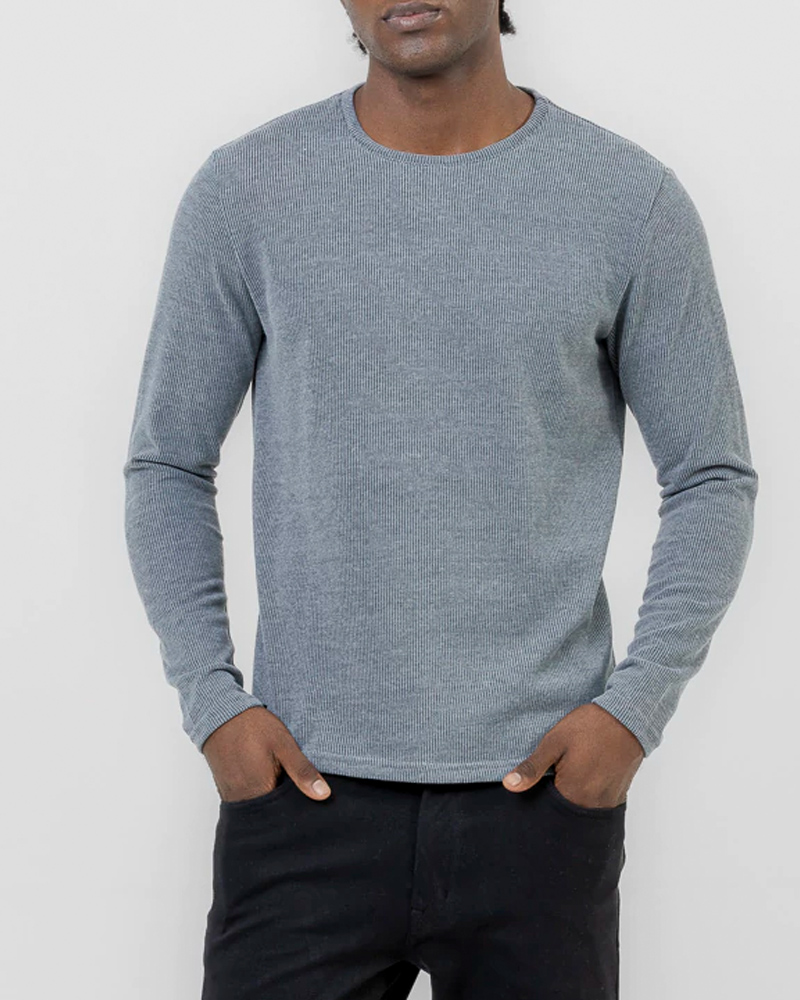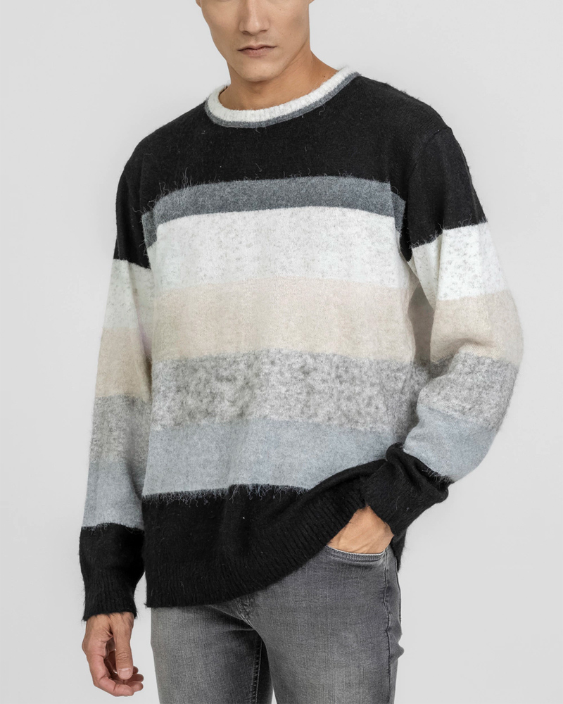 O acabamento escovado do tricot cria uma textura levemente aveludada. As listras em cores contrastantes dão movimento à peça e reforçam o estilo casual com um ar refinado. A gola, barra e punhos têm acabamento canelado, que ajuda no caimento e mantém o formato mesmo após o uso.