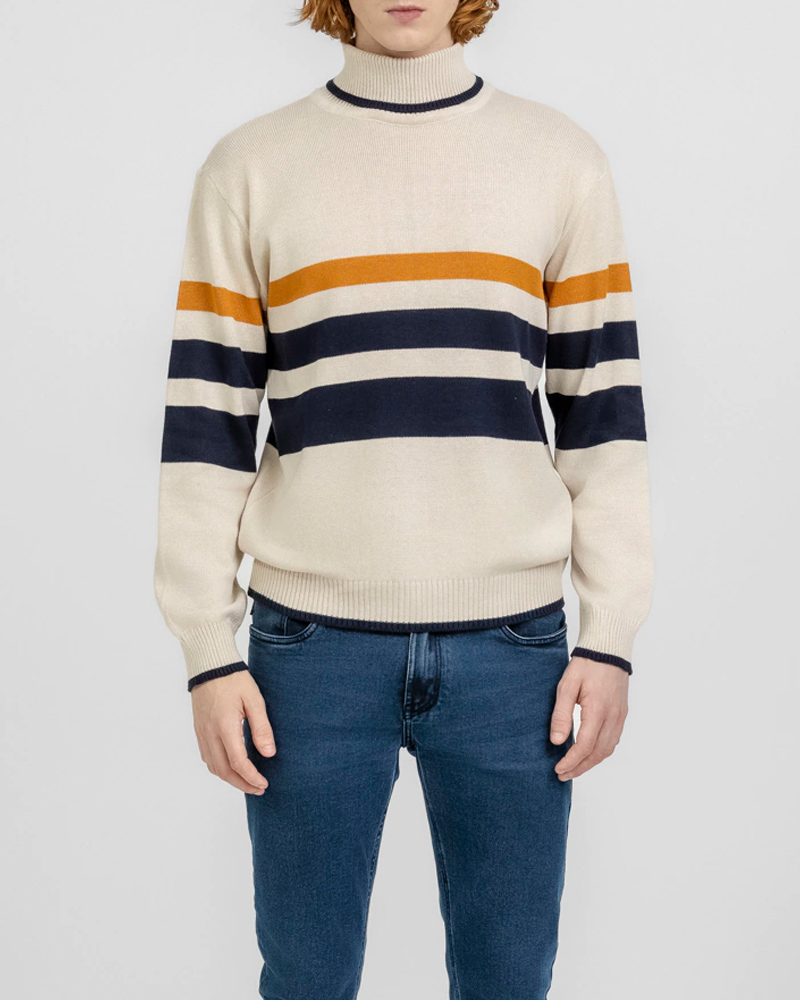 Com gola alta e trama leve, o suéter esquenta bastante. As listras em azul-marinho e mostarda dão um toque contemporâneo ao visual e tiram a peça do óbvio. Fácil de combinar, funciona bem sozinho ou como segunda camada sob jaquetas e casacos.