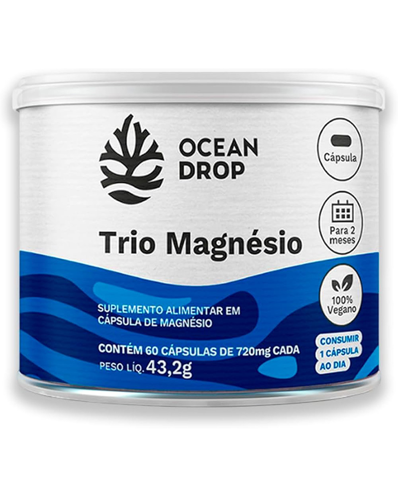 O Trio Magnésio é um suplemento que reúne três tipos diferentes de magnésio em uma única fórmula: dimalato, bisglicinato e óxido de magnésio. Cada um deles atua de um jeito no organismo, e a proposta da Ocean Drop é justamente combinar essas funções para entregar um efeito mais completo do que os suplementos que usam só uma forma do mineral.